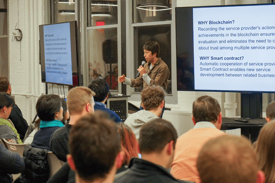 ビションを提示することで、海外の反応を知り、軌道修正や新たな発見が出来ます。ブロックチェーンの事業化はまだまだ発展途上、一人で悶々と考えていると壁にぶつかってしまうことが多々あるので、ニューヨークのブロックチェーンに関心がある人達に、実際に意見をぶつけることで、次のステップが見出だせると思いました。ダメならダメで、それに気付ければ軌道修正ができます。発信をすることが何よりも大事だなと感じましたね。