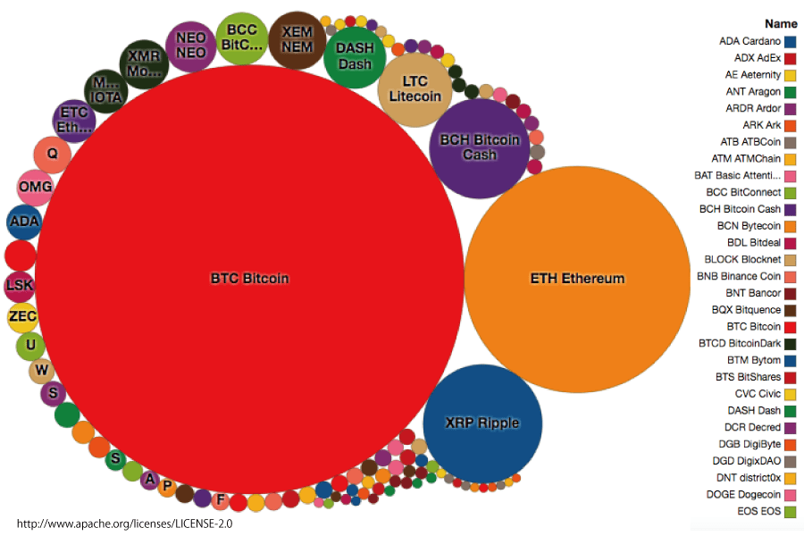 さて、2017年の仮想通貨取引量トップ100種の時価総額マップを見ていきましょう。