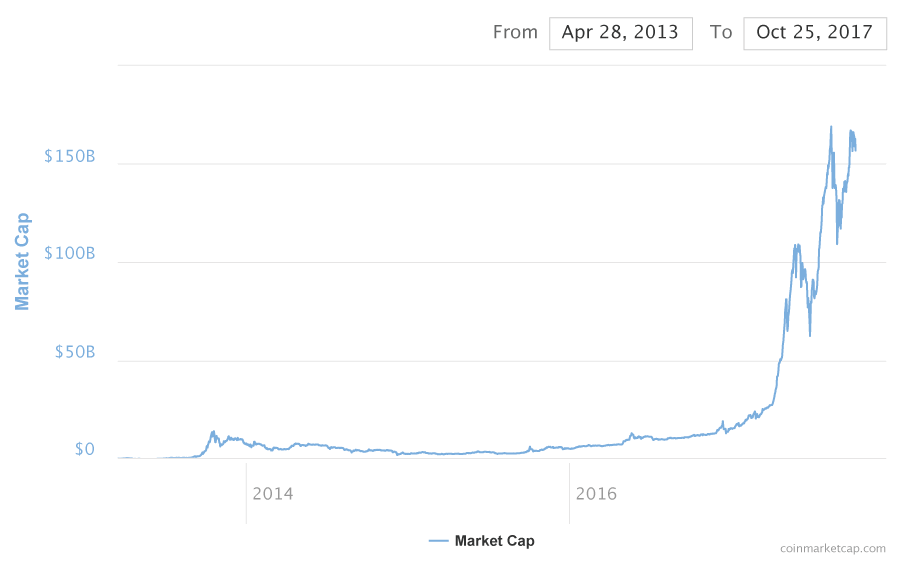 下図は2013年から今年にかけての仮想通貨全体の時価総額です。