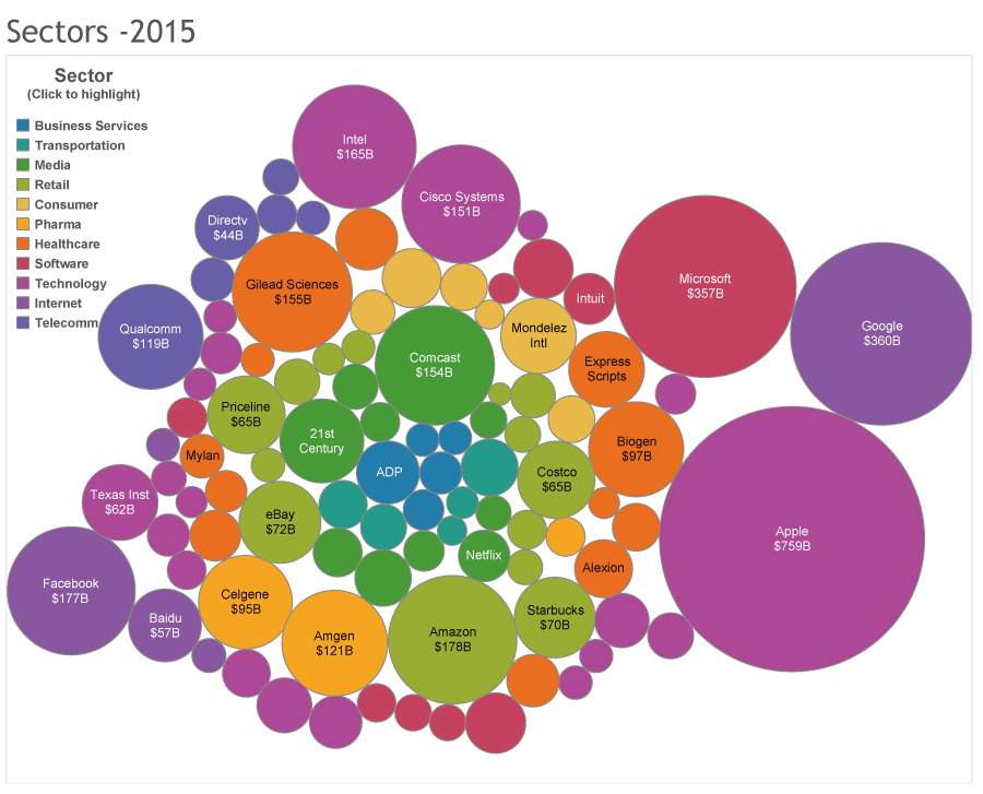 下記は2000年のインターネットバブル期と2015年のNASDAQ銘柄をバブルチャートにしたものです。